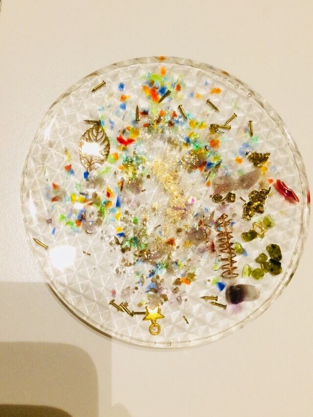 小さいピラミッドがたくさん集まった少し大きめのコースター型のオルゴナイトです