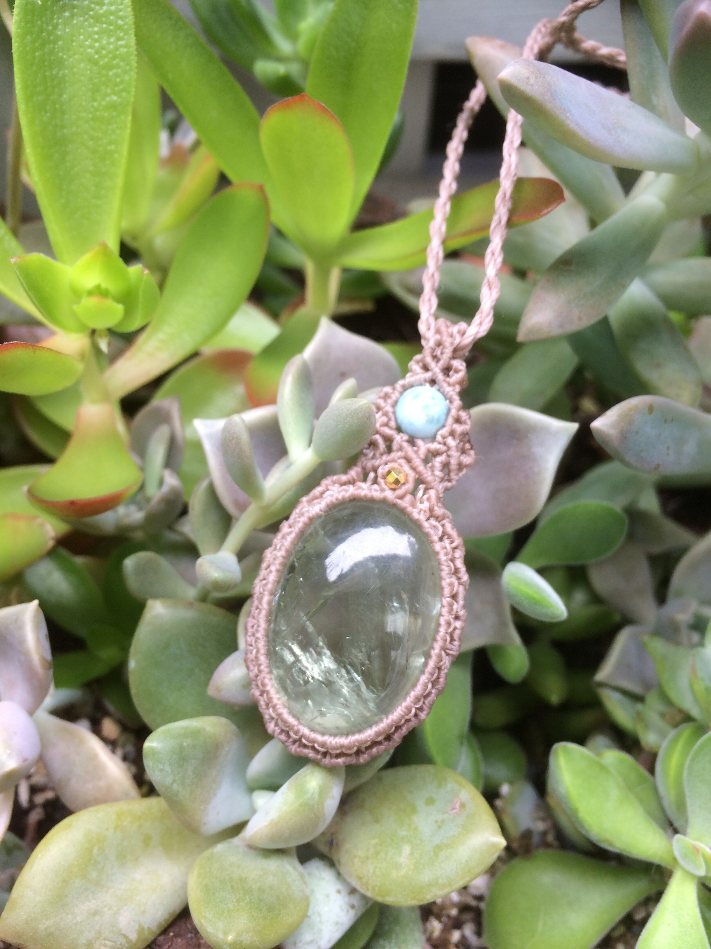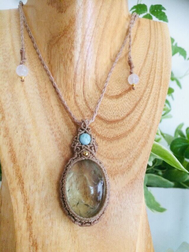 グリーンアメジストとラリマーのマクラメペンダント